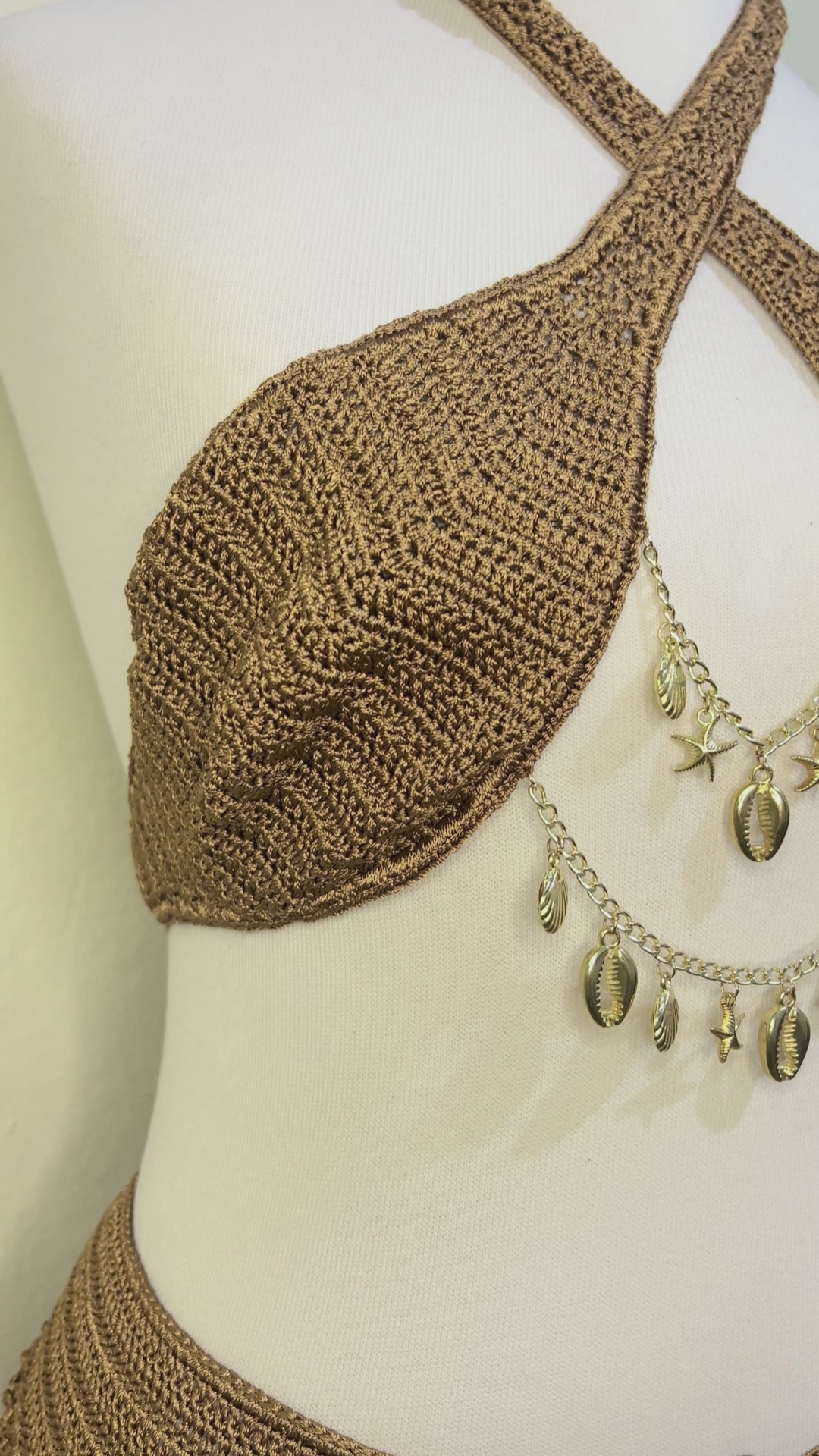 Detalhes Premium: Aplicações de correntes douradas inoxidáveis e búzios naturais selecionados.